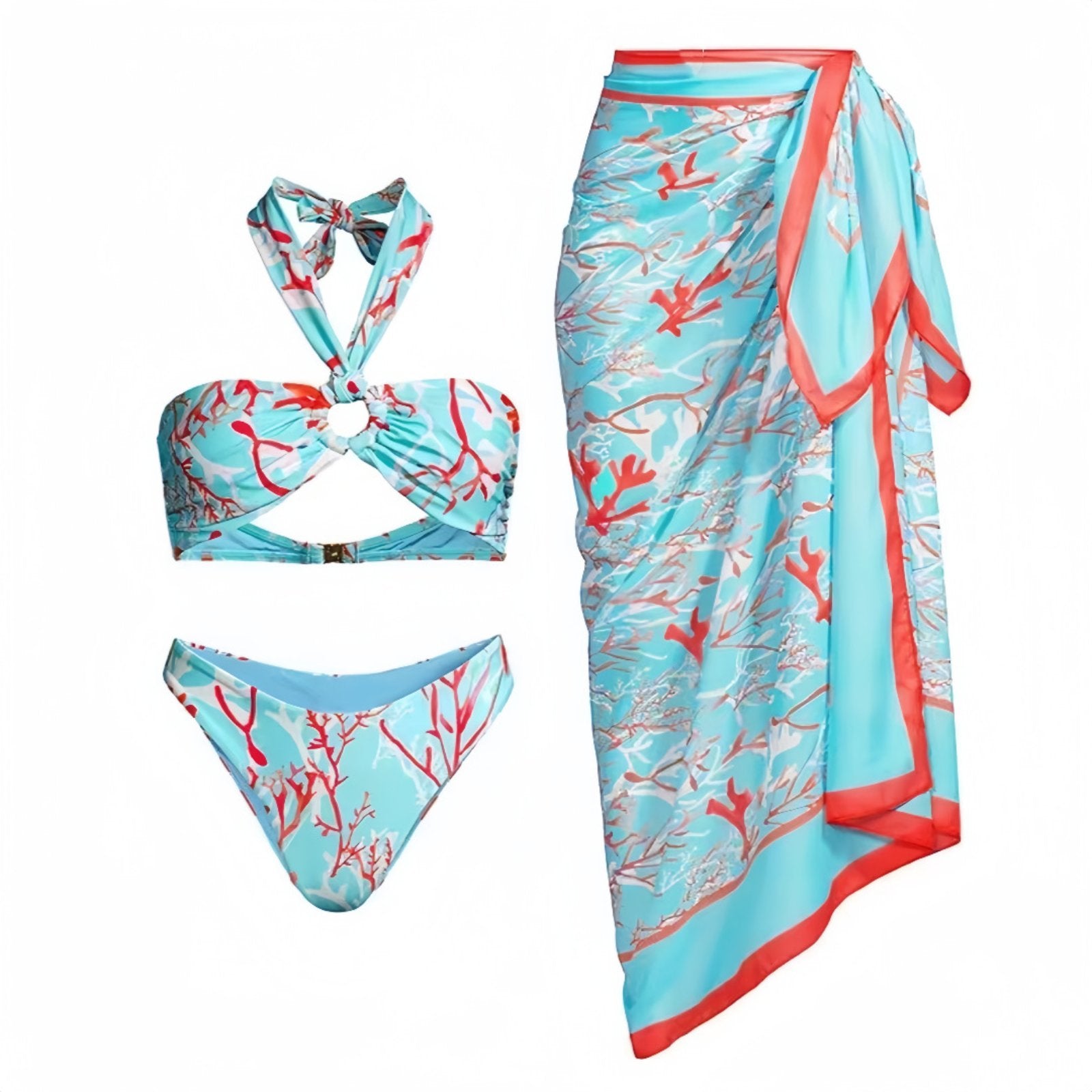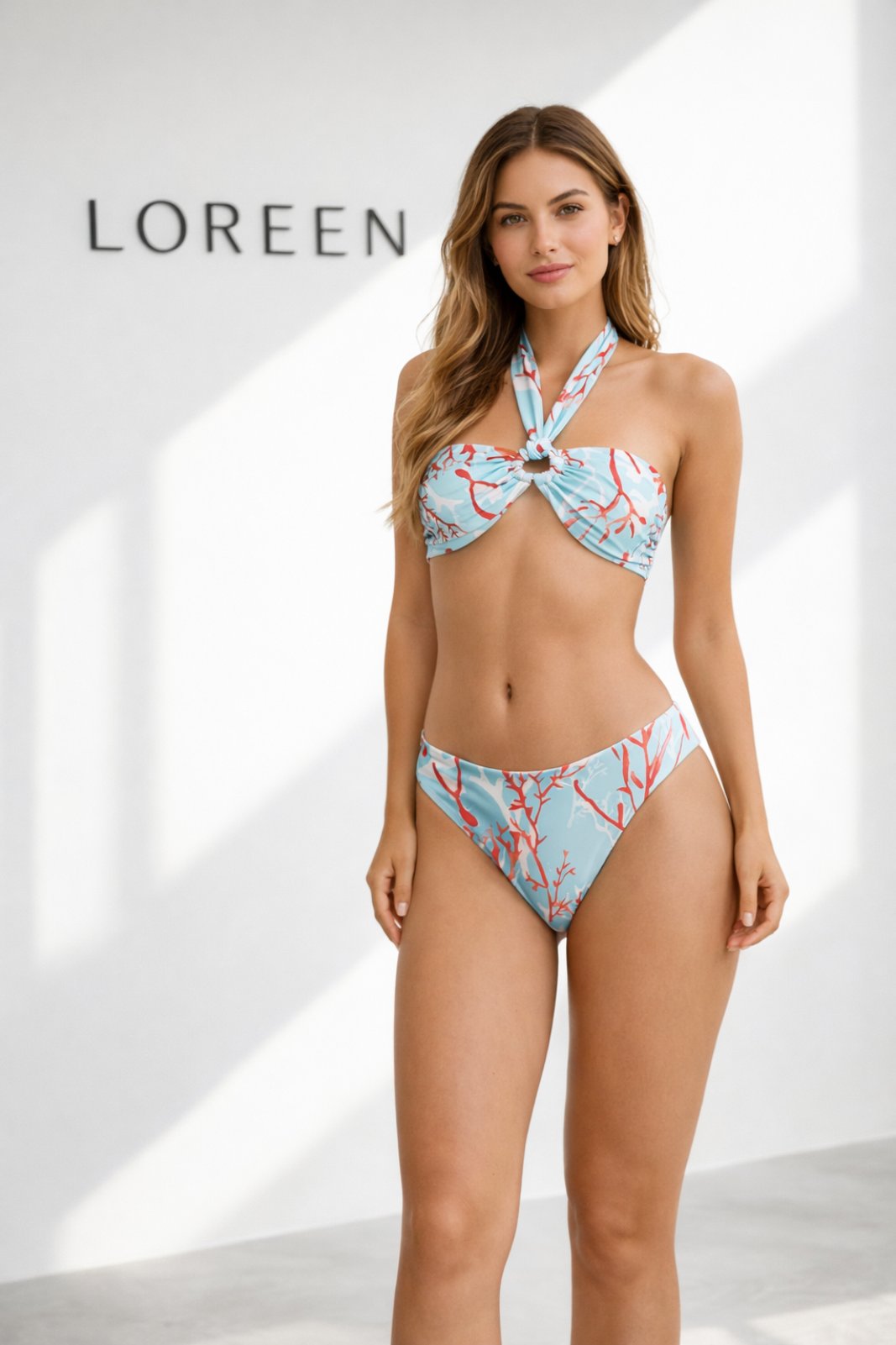 Свеж и впечатляващ бански сет от три части, вдъхновен от морските корали и тюркоазените води. Горнището тип бандо с халтер връзка и декоративен ринг придава модерен акцент и красиво оформя бюста, а класическото долнище осигурява комфорт и елегантен силует.