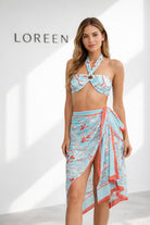 Ефирното парео с контрастен коралов кант допълва визията и позволява лесно стилизиране – идеално за плаж, басейн или стилна разходка край морето.