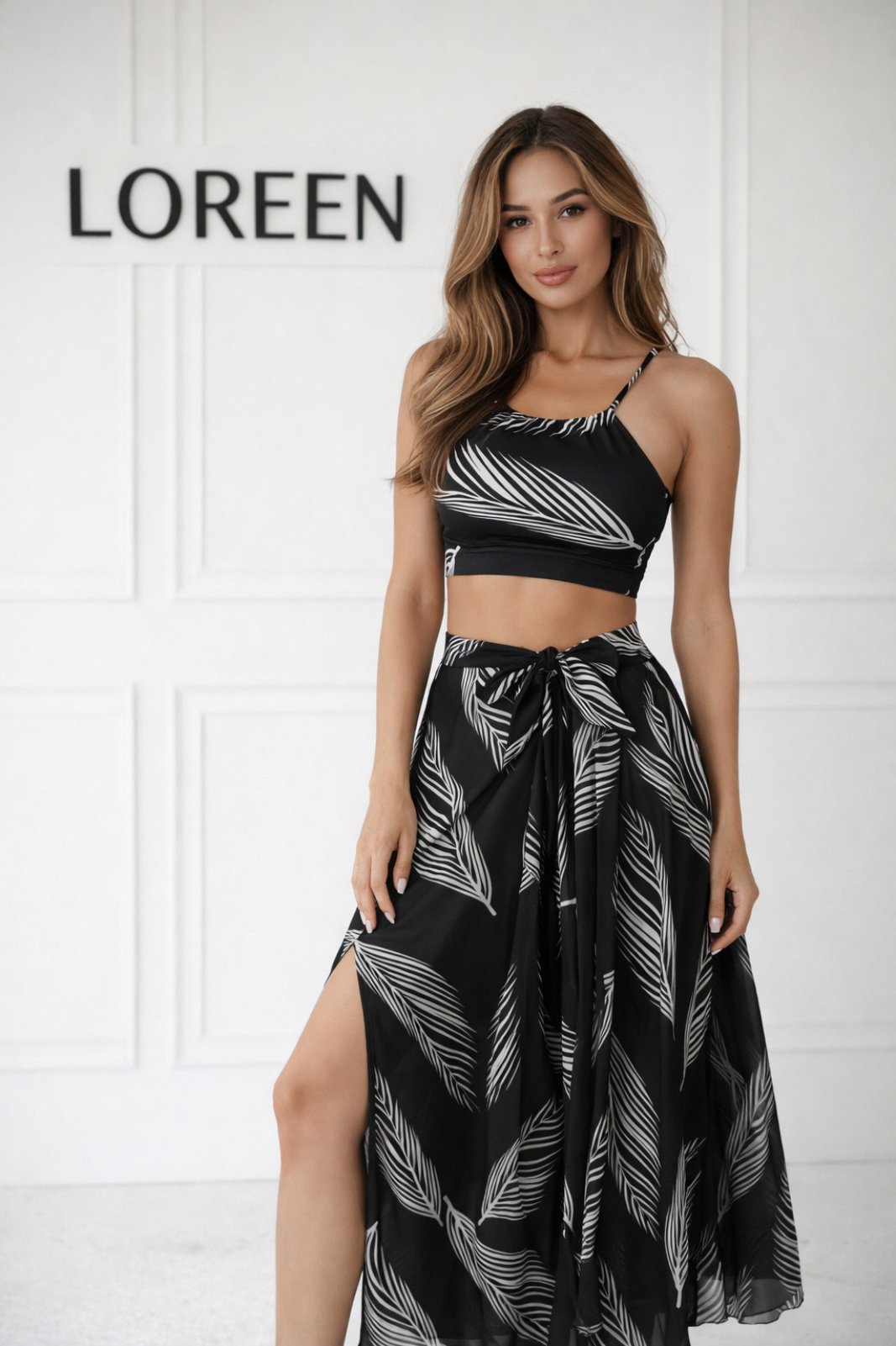 Ефирното дълго парео с връзване отпред и странична цепка добавя движение и женственост, превръщайки комплекта в перфектен избор както за плажа, така и за стилна разходка край морето.