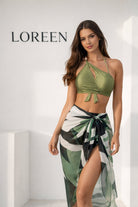 Ефирното парео с артистичен зелен принт и връзване отстрани завършва визията с движение и фин лукс – идеално за плаж, басейн или стилна разходка по залез.