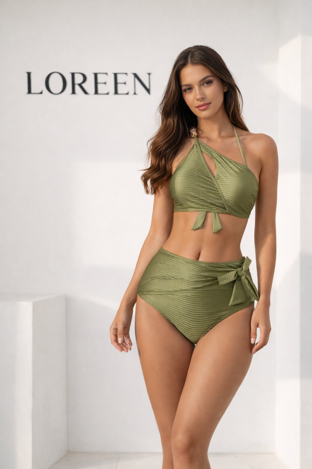 Естествено елегантен бански сет от три части в маслинено зелен нюанс, вдъхновен от природата и средиземноморската лекота.