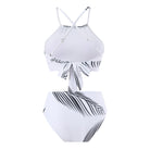 Горнището тип халтер с високо деколте осигурява стабилност и комфорт, докато долнището с висока талия красиво оформя силуета.