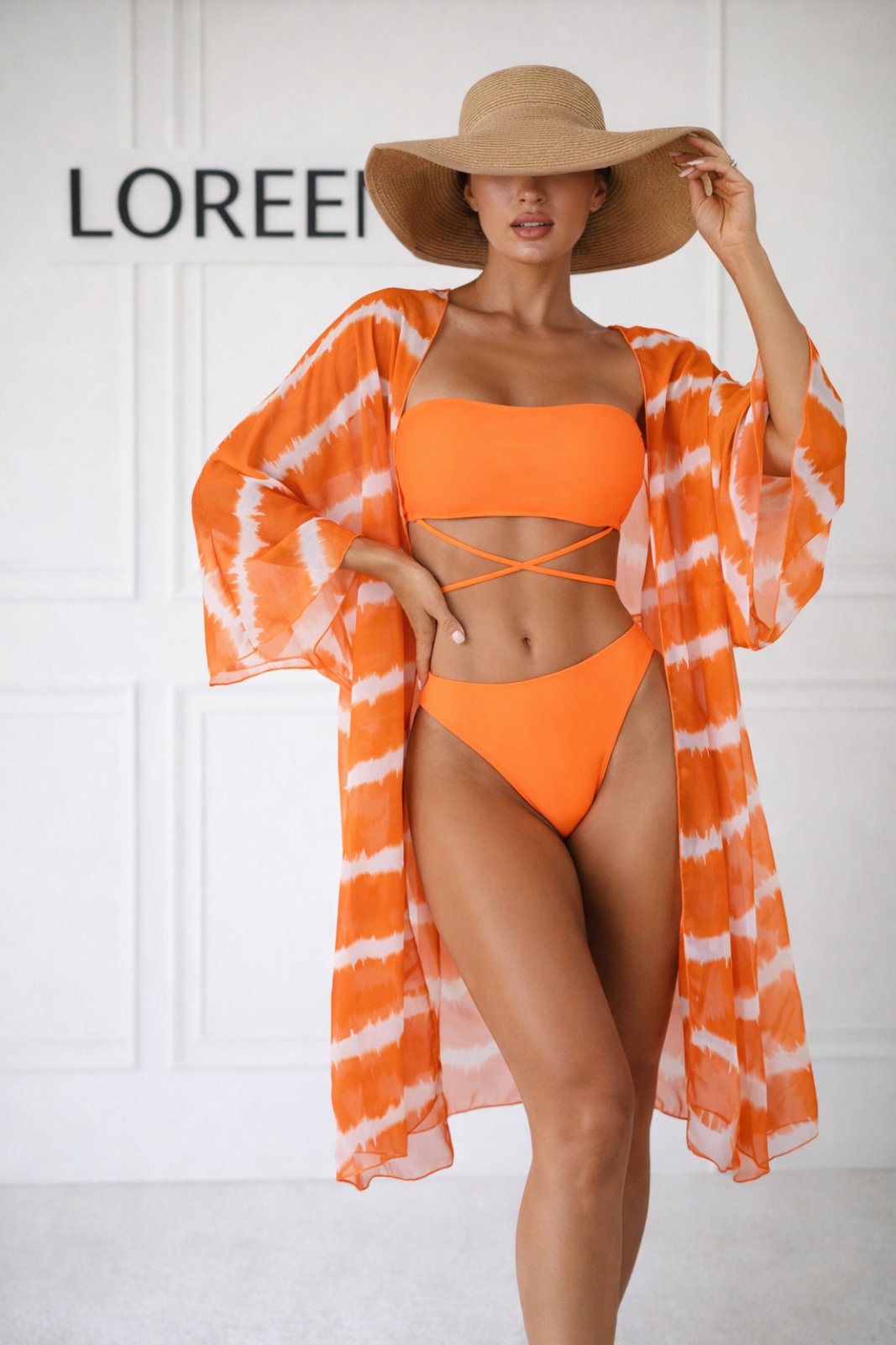Ярък и енергичен бански сет от три части в наситен портокалов нюанс, създаден да привлича погледи и да подчертава летния тен. Горнището тип бандо с декоративни връзки около талията придава модерен и секси акцент, докато долнището с висока талия оформя фигурата и осигурява комфорт.