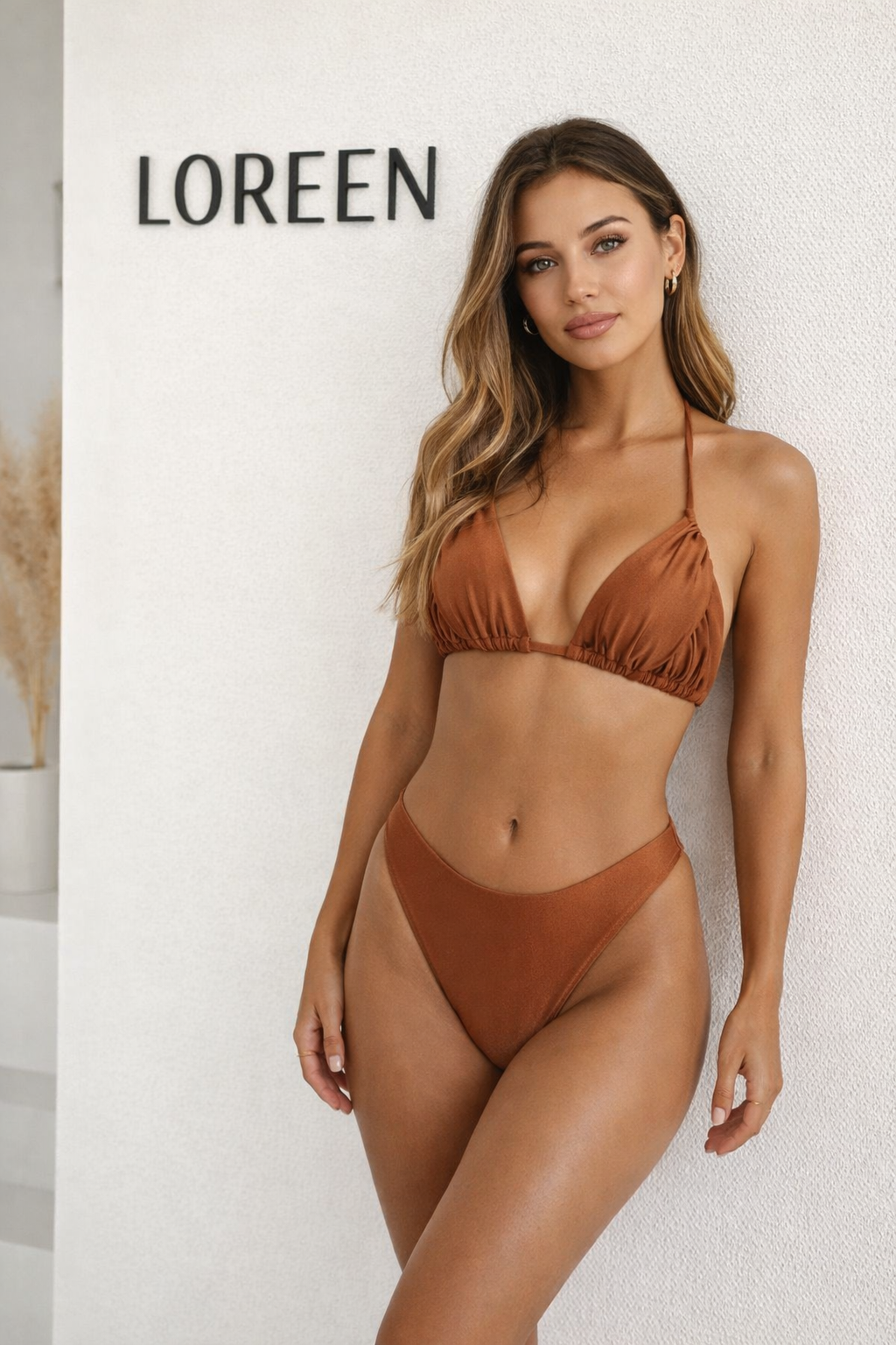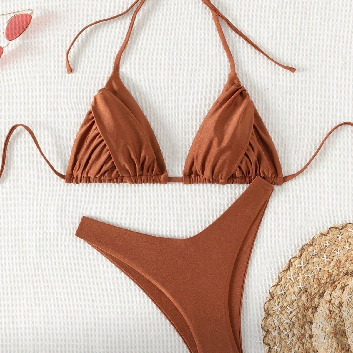 Стилен бански от две части в наситен карамелено-кафяв нюанс, който подчертава тена и придава естествена, чувствена визия. Триъгълното горнище с мека линия оформя бюста по естествен начин, а долнището с изчистен дизайн издължава силуета и създава балансирана, модерна визия.