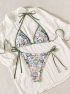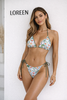 Свеж и романтичен бански от две части с артистичен принт, вдъхновен от средиземноморски градини и винтидж мотиви. Горнището тип триъгълник с халтер връзки подчертава бюста и осигурява персонално прилягане, а долнището с връзки отстрани оформя силуета и добавя нежна женственост.