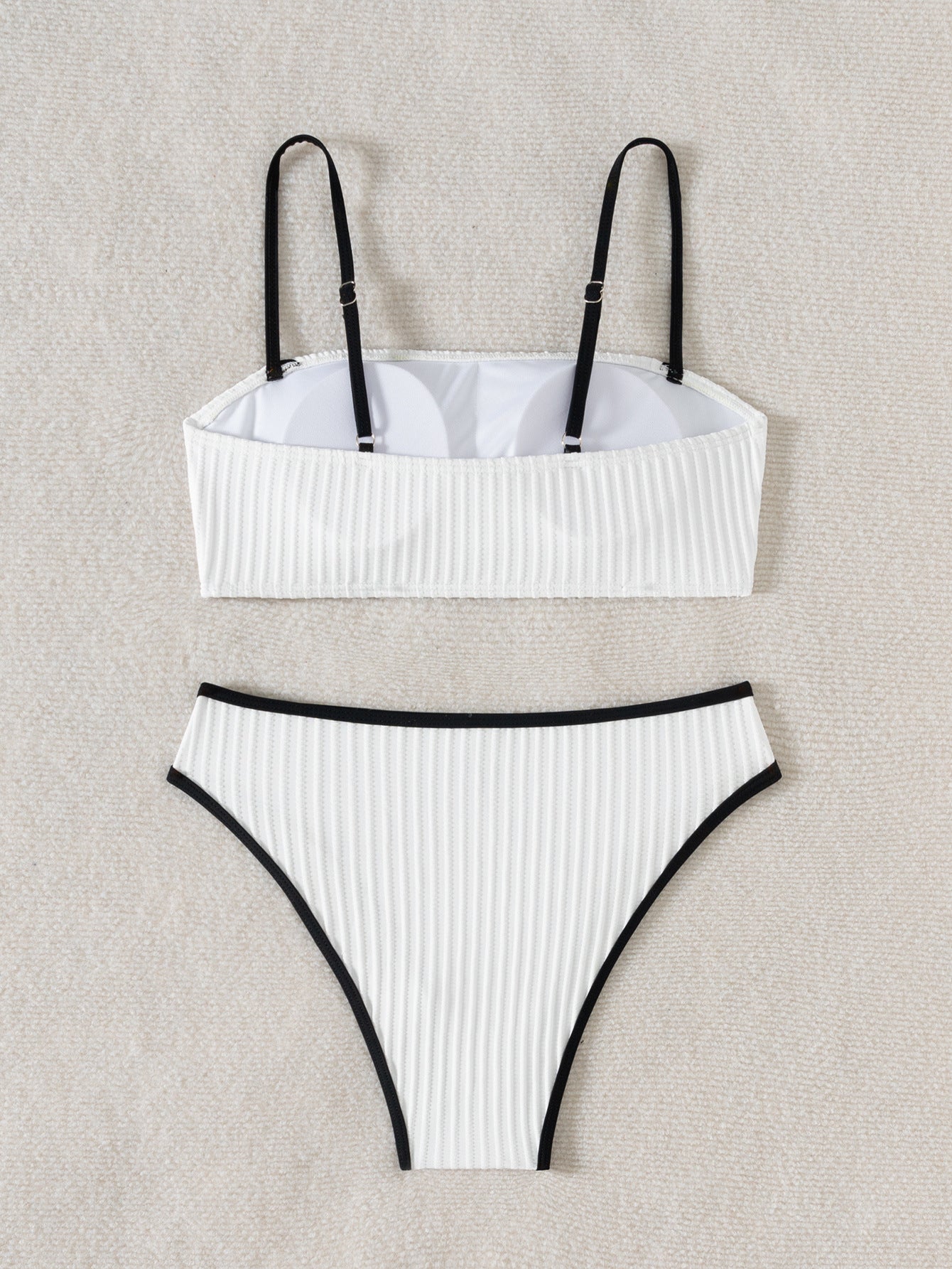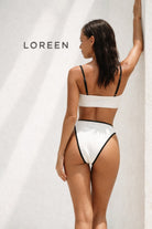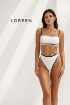 Изчистен и модерен бански от две части в бяло с контрастни черни кантове, създаден за почитателките на елегантния минимализъм. Горнището тип бандо с тънки регулируеми презрамки осигурява комфорт и стабилност, а долнището с висока изрязана линия издължава силуета и подчертава формите.
