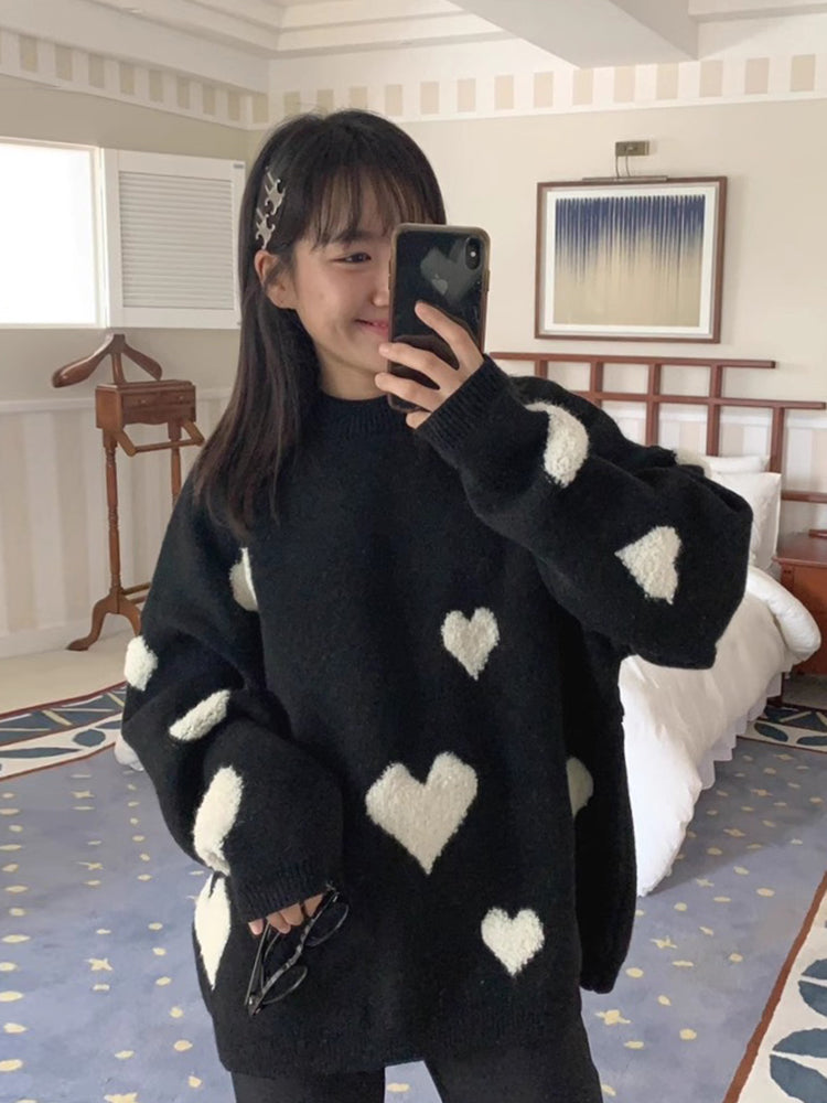 Този плетен пуловер е идеалният избор за есенните и зимните дни, комбинирайки шик с уникален ниша дизайн. С кръгло деколте и жакардов мотив на сърца в контрастиращи цветове, този пуловер е едновременно стилен и универсален, подходящ за всякакви поводи.
