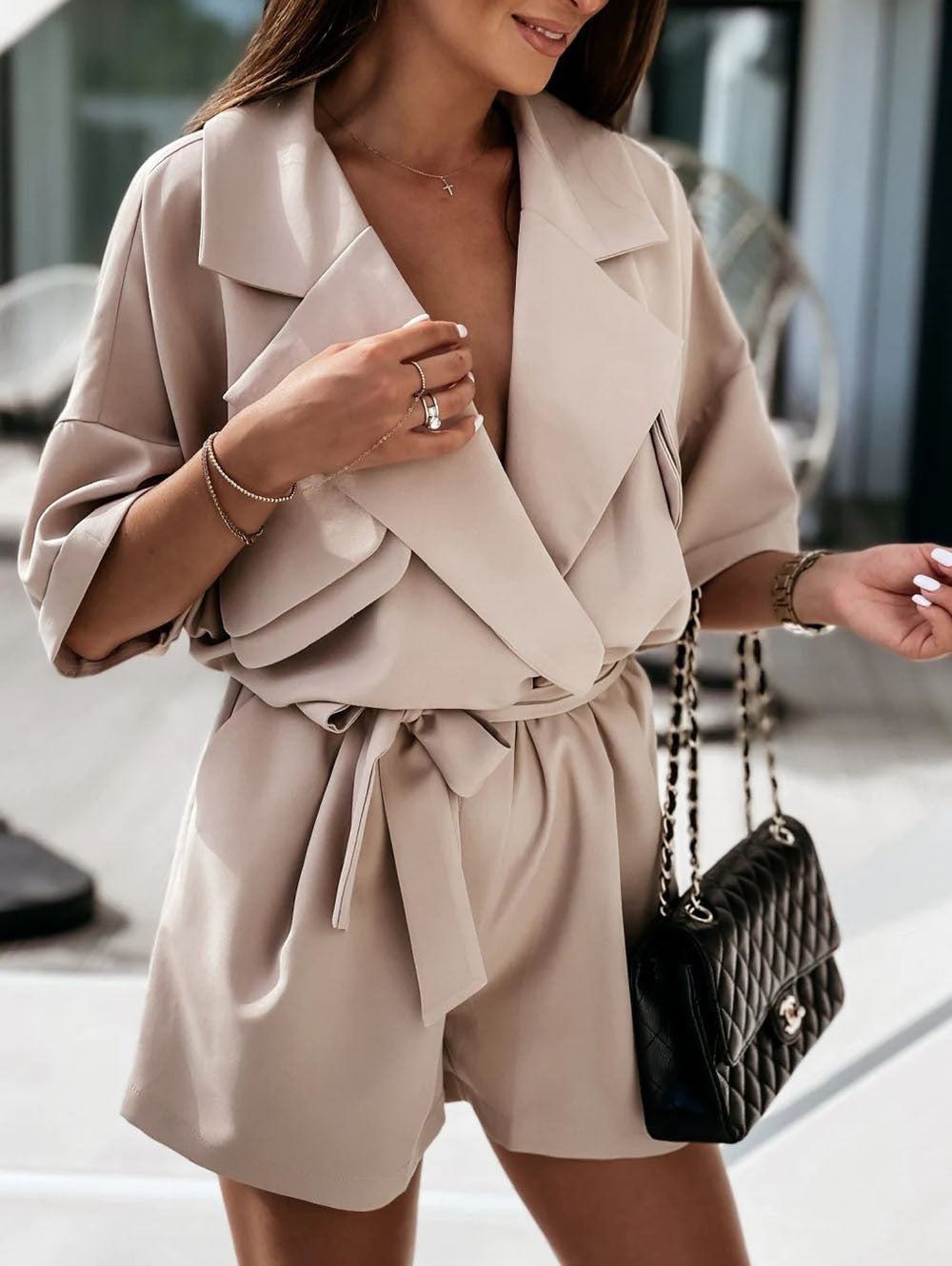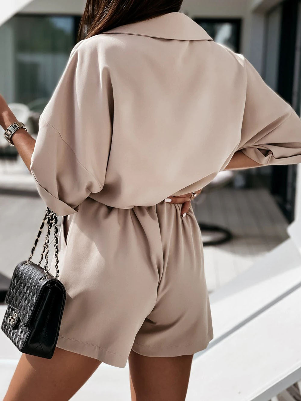 С къси ръкави, този гащеризон придава игривост и свежест на визията ви, като в същото време запазва елегантността и стила си. Яката тип риза допълнително акцентира върху визията, придавайки един по-класически и изтънчен вид.