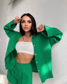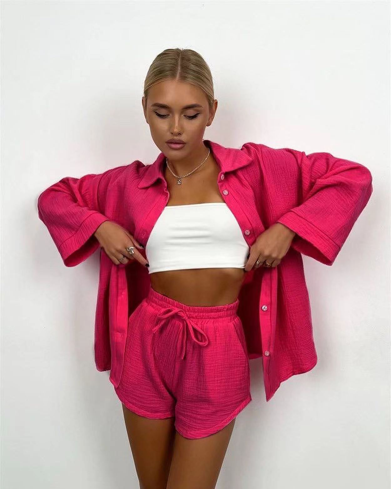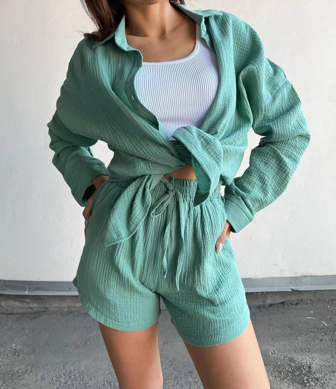 Дамският комплект от две части, включващ риза с дълги ръкави и шорти, е перфектният избор за жените, които търсят стилна и удобна визия. Този комплект съчетава елегантността на ризата с дълги ръкави и небрежността на шортите, предоставяйки възможност за носене през различни сезони и поводи.