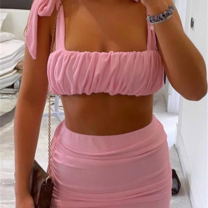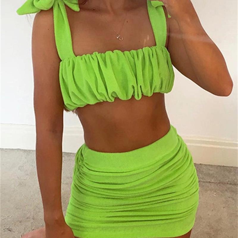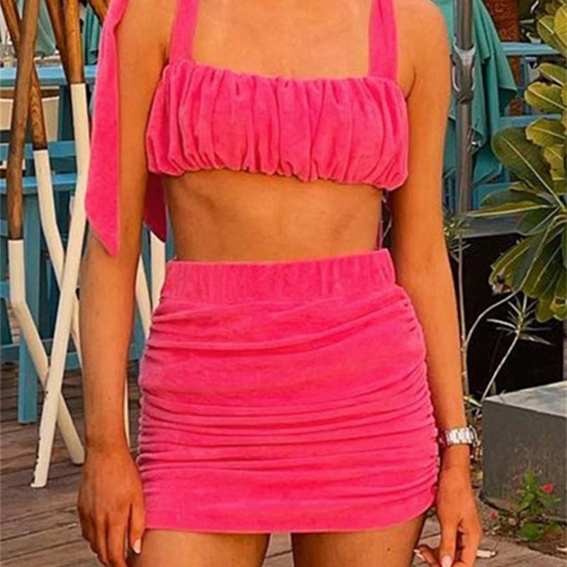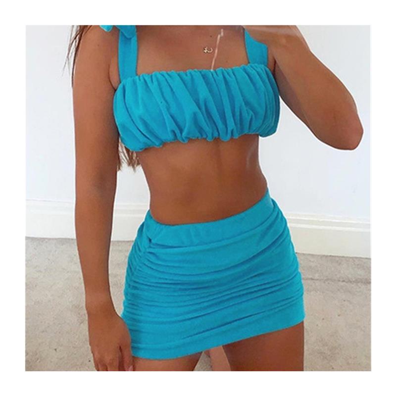 Този комплект е перфектното решение за лятото, комбинирайки елегантност и стил. Полата се съчетава с топа, който може да се върже на врата, за да създадете уникален и модерен външен вид.