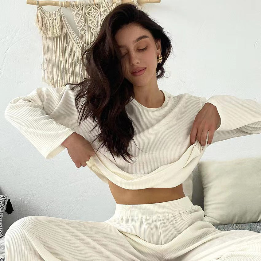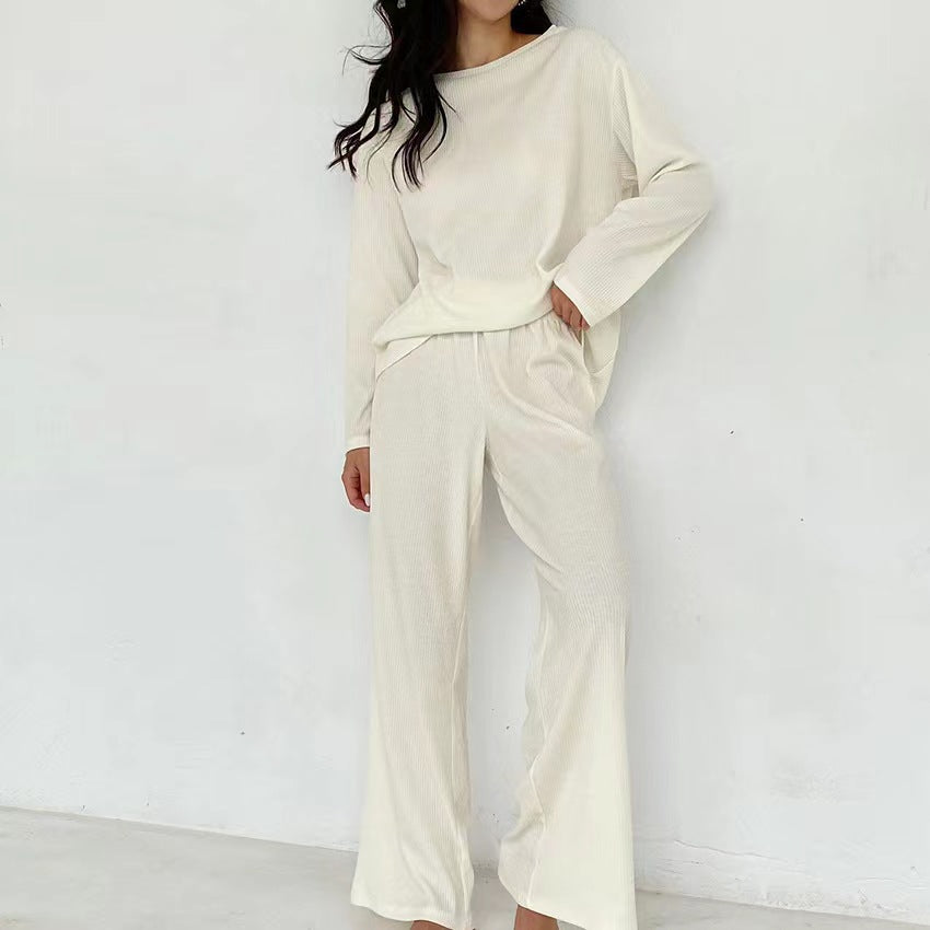 Свободен комплект, състоящ се от горнище с дълги ръкави и панталон, който съчетава модерен стил с уют. Изчистеният и непринуден дизайн го прави подходящ както за домашно облекло, така и за неформални срещи.
