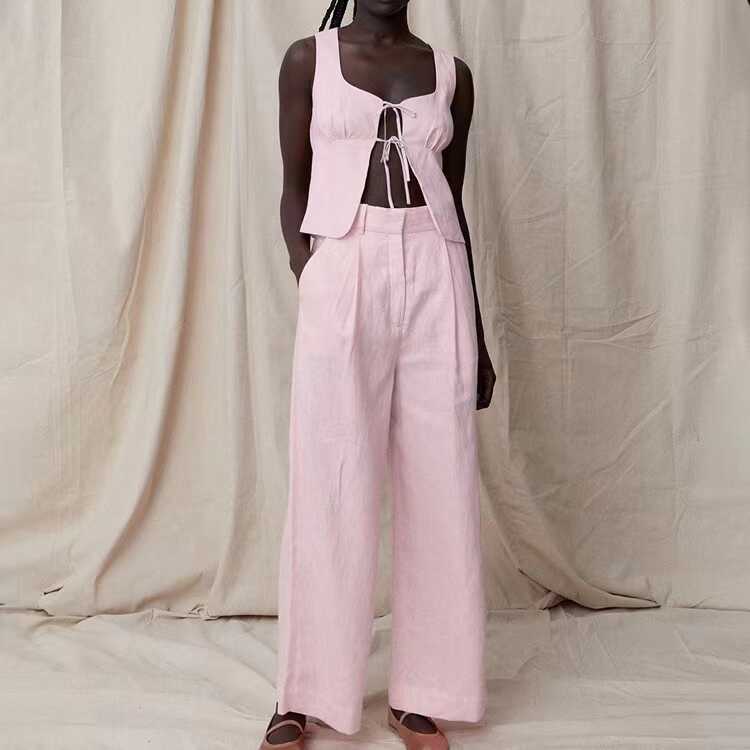 Представяме ви новия секси комплект с връзки на потника и панталони с висока талия и широки крачоли. Този стилен и елегантен комплекте перфектният избор за съвременната жена, която иска да изглежда модерно и уверено.
