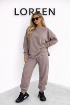 Суитшъртът се отличава  плътни ръкави и свободен силует, който добавя спокойствие и уют към облеклото.Този комплект е идеален за спортни дейности или за ежедневно облекло, като предлага съчетание от модерен стил и удобство през целия ден. С него ще излъчвате увереност и стил, без да правите компромиси с комфорта.