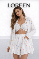 Комплект от три части със сладък принт. Този чаровен комплект включва топ, къси панталони и риза с щампи, които придават игрив и романтичен вид. Топът е с изящни детайли и приятна за носене материя, докато късите панталони добавят елегантност и движение към визията.