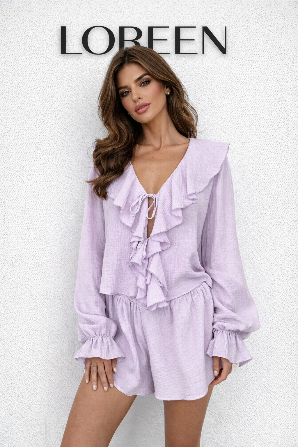 Летен дамски комплект от две части, изработен от мек и дишащ памук. Включва горна част риза с ефирни волани и къси панталони с удобна кройка. Семпъл и модерен дизайн в стилен лилав цвят, идеален за горещите дни.