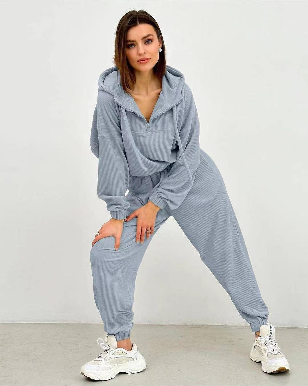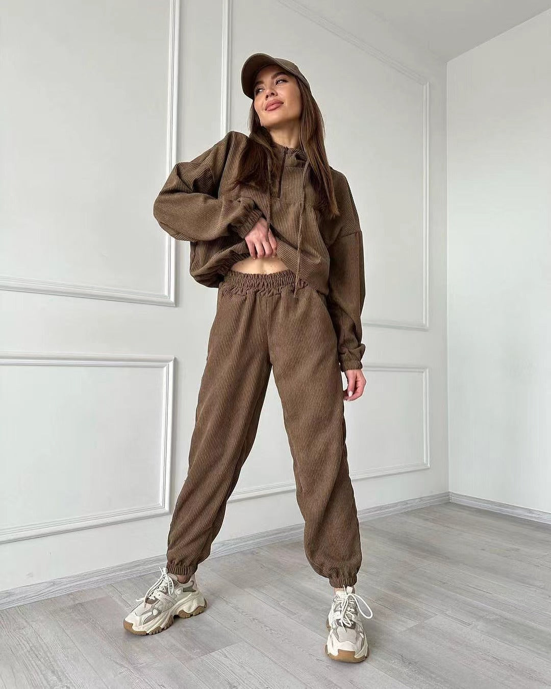 Комплект от две части, включващ горнище с качулка и дълги ръкави, както и панталони. Подходящ за ежедневно носене и спортни активности.