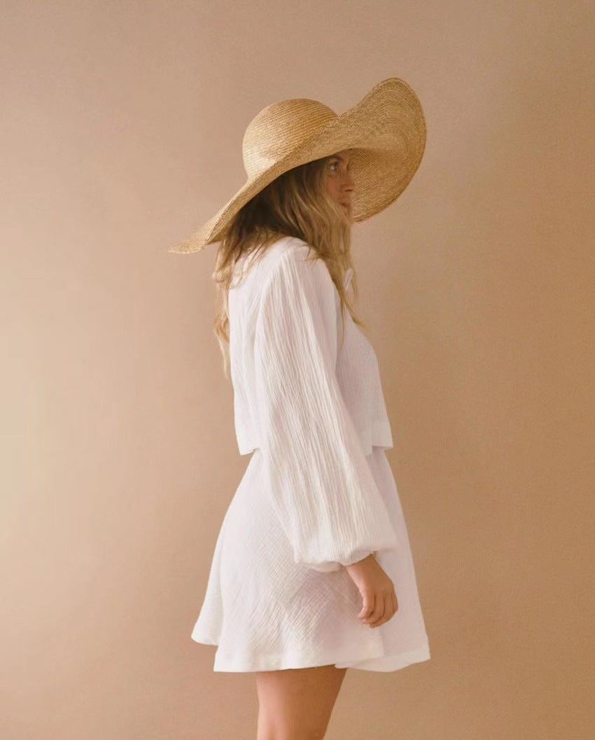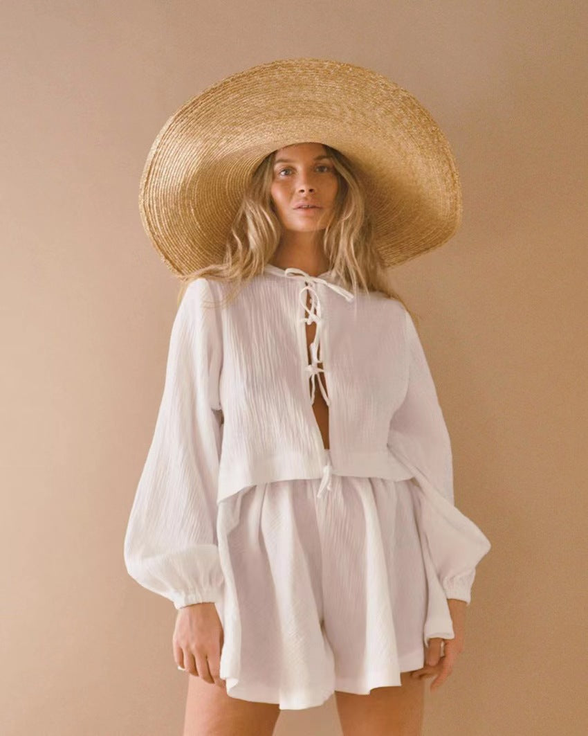 Горната част е със завързване отпред, което добавя изисканост и уникалност към визията. Късите панталони също имат връзки, които придават допълнителен акцент и стил.