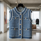 Открийте съвършенството в детайлите с нашия деним елек "Chic Tweed". Съчетавайки класическия комфорт на денима с изисканата текстура на туида, този елек е идеалното допълнение към Вашия гардероб. С елегантни копчета и ръчно обработени краища, той добавя неповторим стил и завършеност на всяка визия. Носете го над риза за елегантен офис аутфит или със семпла тениска за шикозен ежедневен вид.