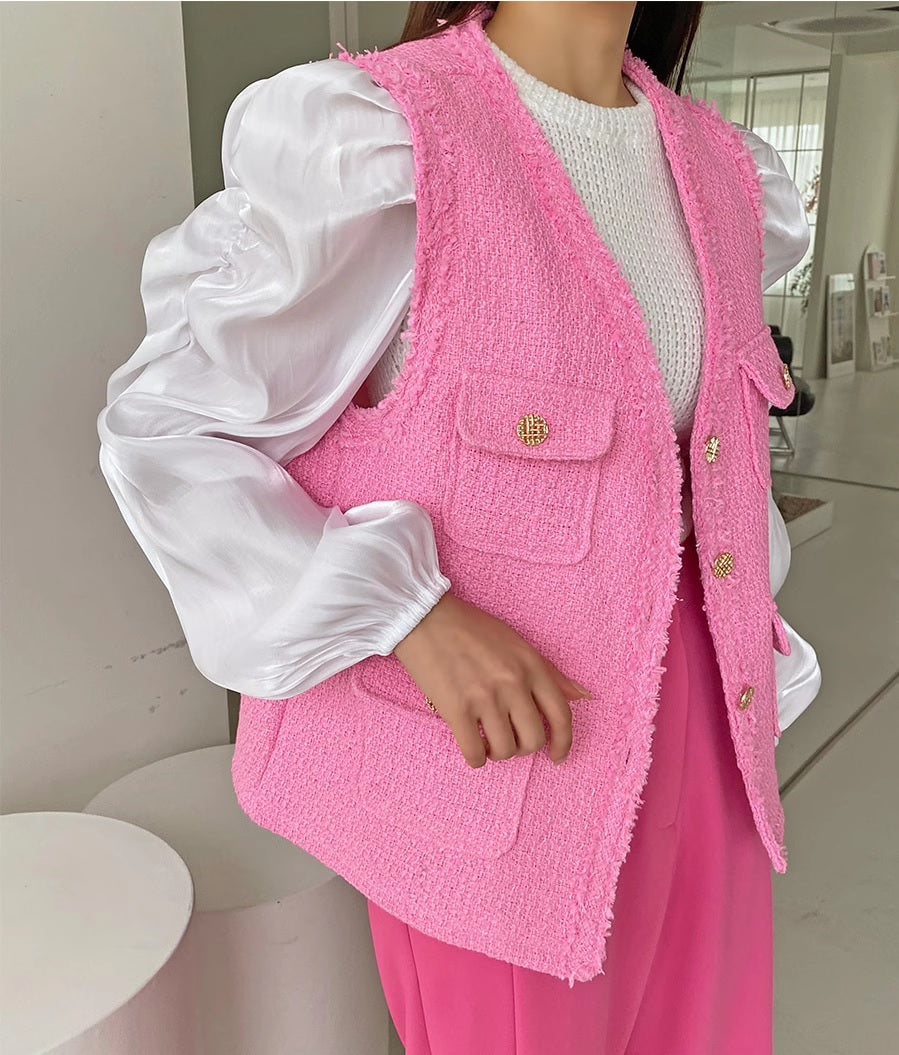 Този елек с V-образно деколте и метални копчета в шик стил е идеално за есента, предлагайки комбинация от модерни акценти. Съчетава се лесно с различни облекла и добавя нотка на изтънченост към всеки гардероб.