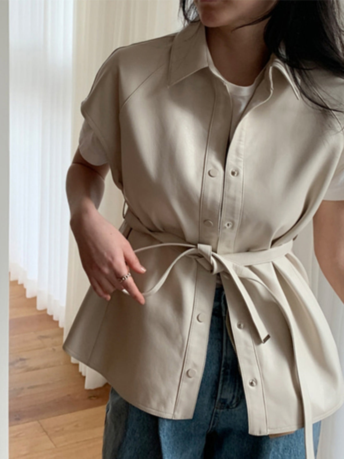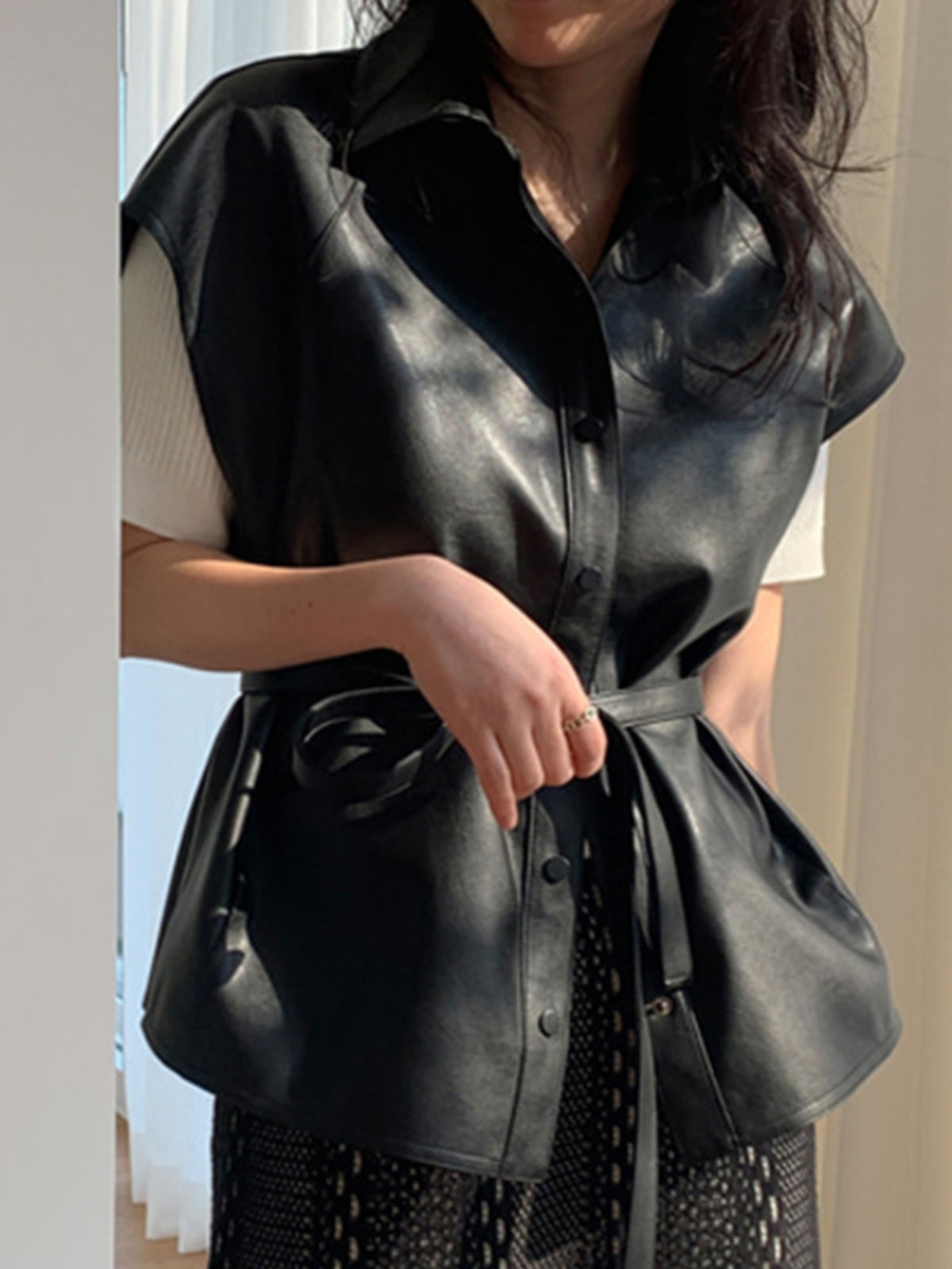 Елека е изработен от висококачествена изкуствена кожа с меко и гладко покритие, което създава усещане за лукс и комфорт. Без ръкави, то придава модерна и свежа визия, като същевременно запазва класическия ретро дух. Едноредното закопчаване с метални или облечени в кожа копчета допълва винтидж стила на дрехата.