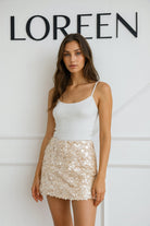 Елегантна къса пола, покрита с фини пайети в нежен шампански нюанс, които създават мек, изтънчен блясък. Champagne Glow е перфектното допълнение към луксозна плажна визия – дискретна, но впечатляваща, подходяща както за комбинация с бански, така и за вечерни летни събития.