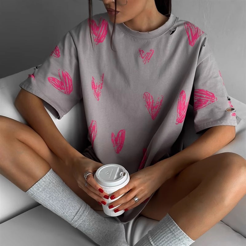 Със своя уникален дизайн и модерния печат на сърца, тази тениска привлича вниманието си и придава свежест на визията ви.