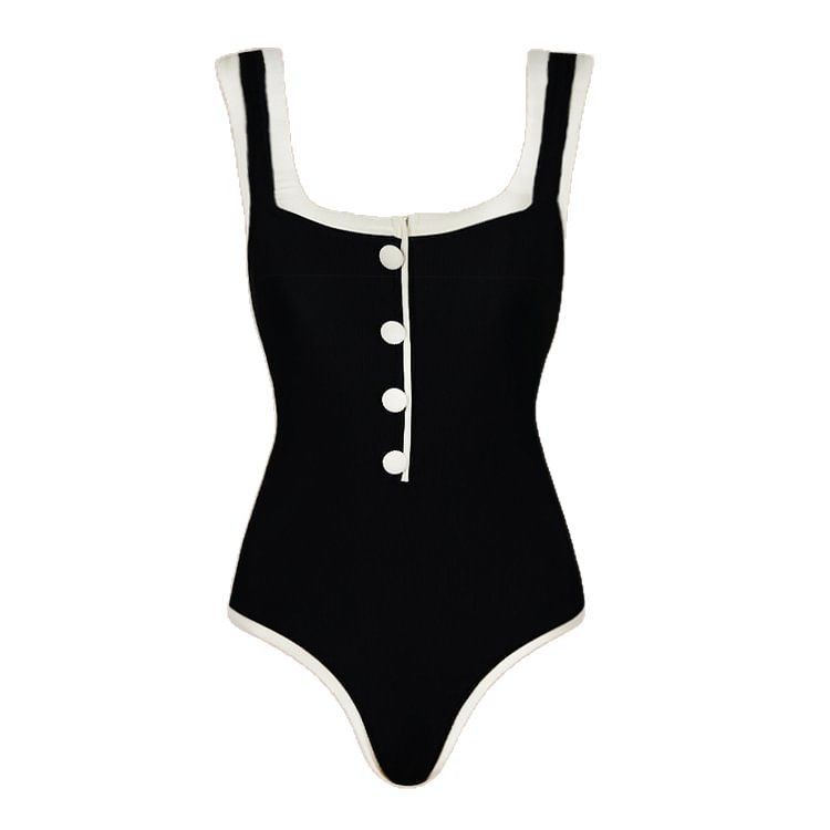 Изтънчен комплект, съчетаващ цял бански костюм и стилна плажна пола в класическа черно-бяла гама. Банският с изчистена линия, контрастни кантове и декоративни копчета подчертава фигурата и придава елегантен, винтидж характер. Плажната пола допълва визията с модерен силует и удобство, превръщайки комплекта в перфектен избор както за плажа, така и за крайбрежна разходка.