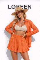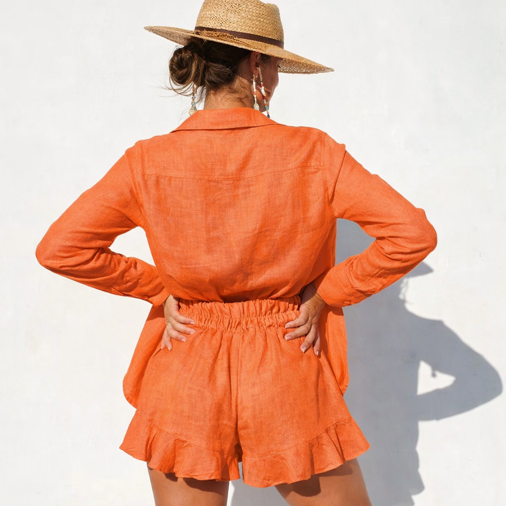 "Стилният комплект с дълъг ръкав и къси панталони" е изискано съчетание от неформален стил и елегантност. Този комплект представлява дълъг ръкав риза и къси панталони с вълнисти детайли, които допринасят за уникалността на визията.