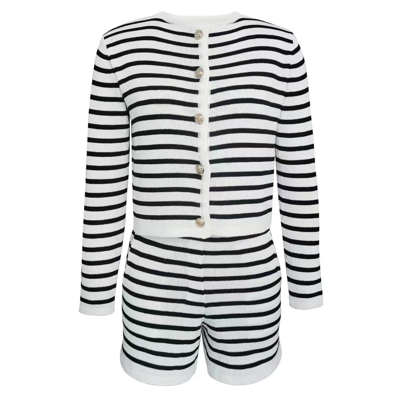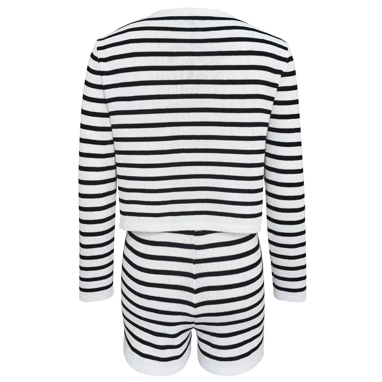 Шортите са също изработени от качествена плетена материя и са с къс силует, подходящ за топлите дни или за носене в закрити помещения. Райето на шортите съответства на това на жилетката, което прави комплекта хармоничен и завършен.
