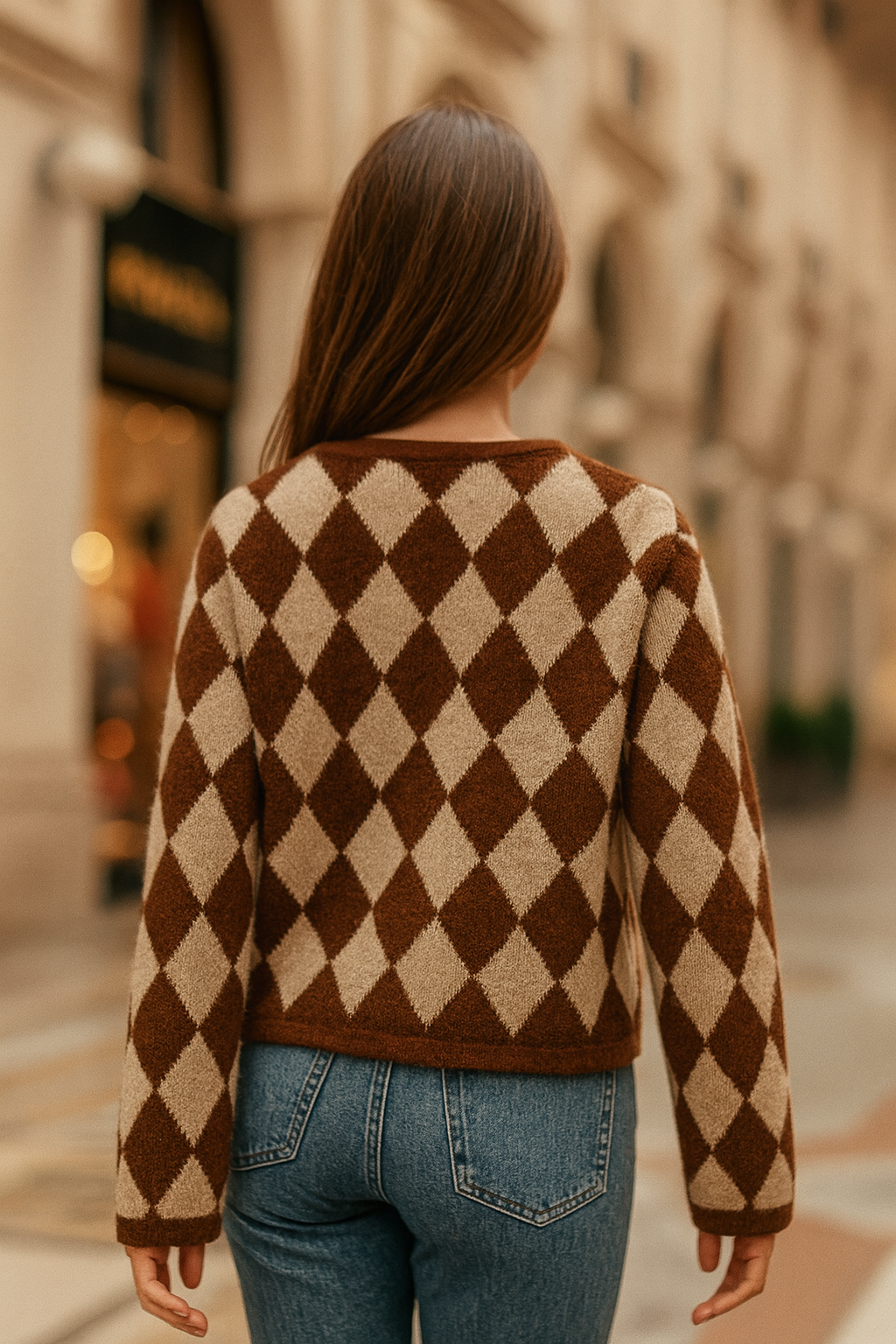 Изработена от мека, уютна материя, тя впечатлява с изтънчен ромбовиден десен в топли кафяви и бежови нюанси.
