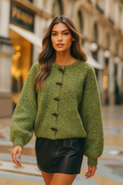 Изработена от мека плетена материя с богата текстура и топъл зелен нюанс, тя носи усещане за естествена елегантност и уют.