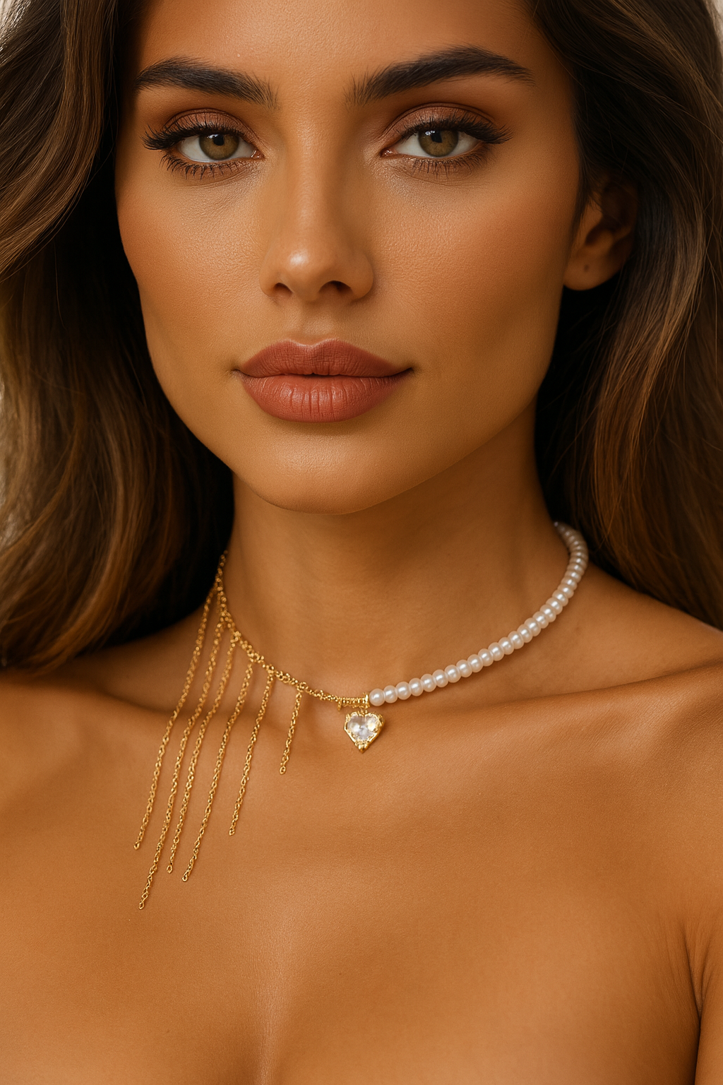 Aurora Pearl е символ на нежност, светлина и изисканост. Изработено от естетично подбрани перли, циркони и кристална висулка във форма на сърце, това колие излъчва деликатен блясък, който обгръща врата с фин лукс.
