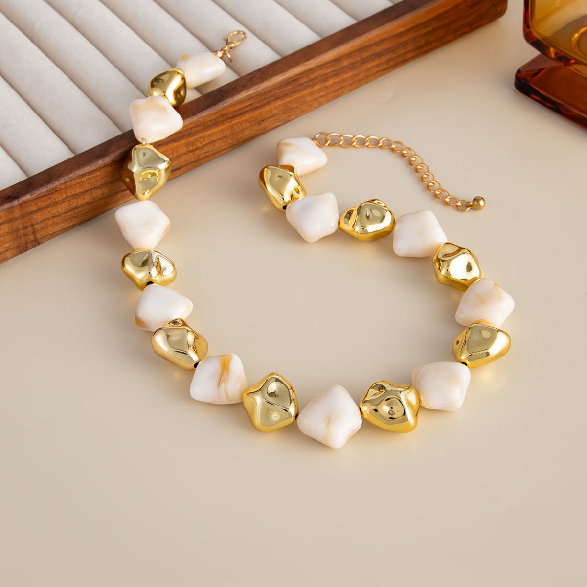 Ivory Gold е впечатляващо колие, което съчетава естествената мекота на светлите камъни с богатия блясък на златистите елементи. Контрастът между матовото и гланцовото създава усещане за изтънчен лукс и модерна елегантност.