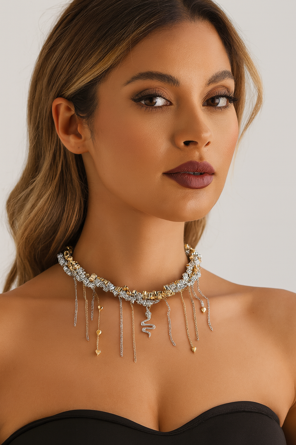 Двуцветният дизайн в злато и сребро, допълнен с фини висулки и централна змия — символ на сила и женственост — превръща това бижу в акцент, който няма как да остане незабелязан.