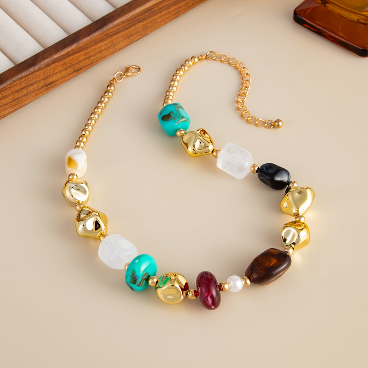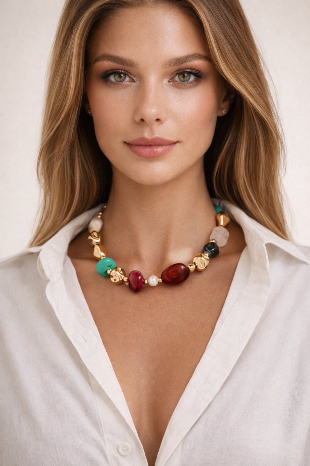 Terra Aura е ефектно колие, което съчетава естествени камъни в богата цветова палитра със златисти акценти. Органичните форми и наситените нюанси – зелено, бордо, млечно бяло и земни тонове – създават усещане за топлина, баланс и връзка с природата.