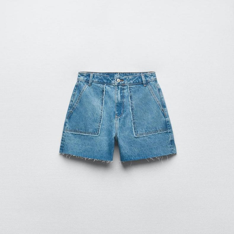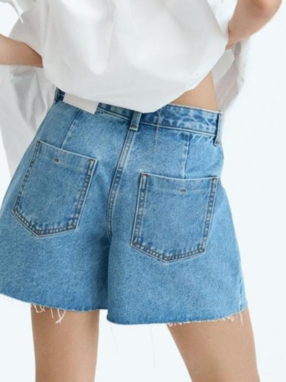 Шортите са с необработени ръбове, което придава небрежен и винтидж вид. Този стил допринася за модерния и разчупен външен вид на облеклото.