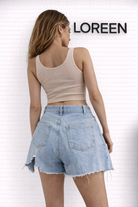 Този продукт е представителен за модерния стил, представляващ дънкови шорти с висока талия за жени. Шортите имат свободен силует, който подчертава женските извивки, като същевременно предоставя удобство и комфорт през горещите летни дни.