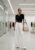 Открийте върха на елегантността с нашите бели панталони с широк крачол. Изработени от висококачествена материя, те предлагат несравним комфорт и безупречен силует, който издължава фигурата. Перфектни за офис облекло, официални събития или стилна ежедневна визия, тези панталони са идеалното допълнение към всеки гардероб. Съчетайте ги с любимия си топ за изискан и модерен вид.