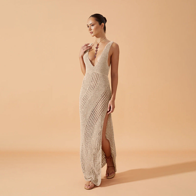 Елегантна дамска плетена плажна рокля с цепка, идеална за летни дни край морето. Изработена от лека и дишаща материя, която осигурява комфорт и стил. Цепката добавя модерен акцент, правейки роклята перфектна за носене над бански или за небрежна лятна визия.