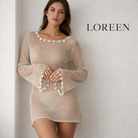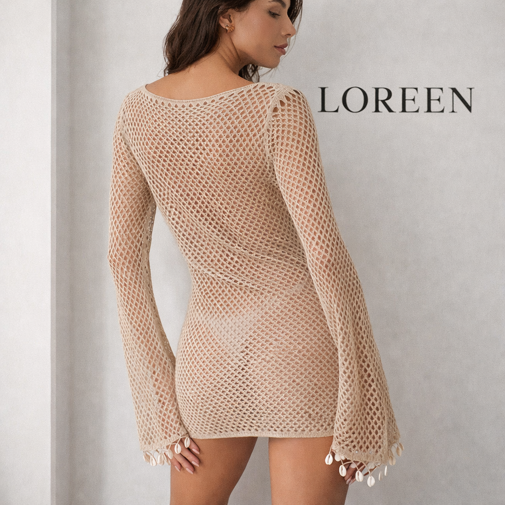 Ефирна и изключително женствена плажна туника, създадена от фина мрежеста материя в нежен пясъчно-бежов нюанс. Деликатните декоративни мидички по деколтето и ръкавите придават естествен морски чар и усещане за лукс.