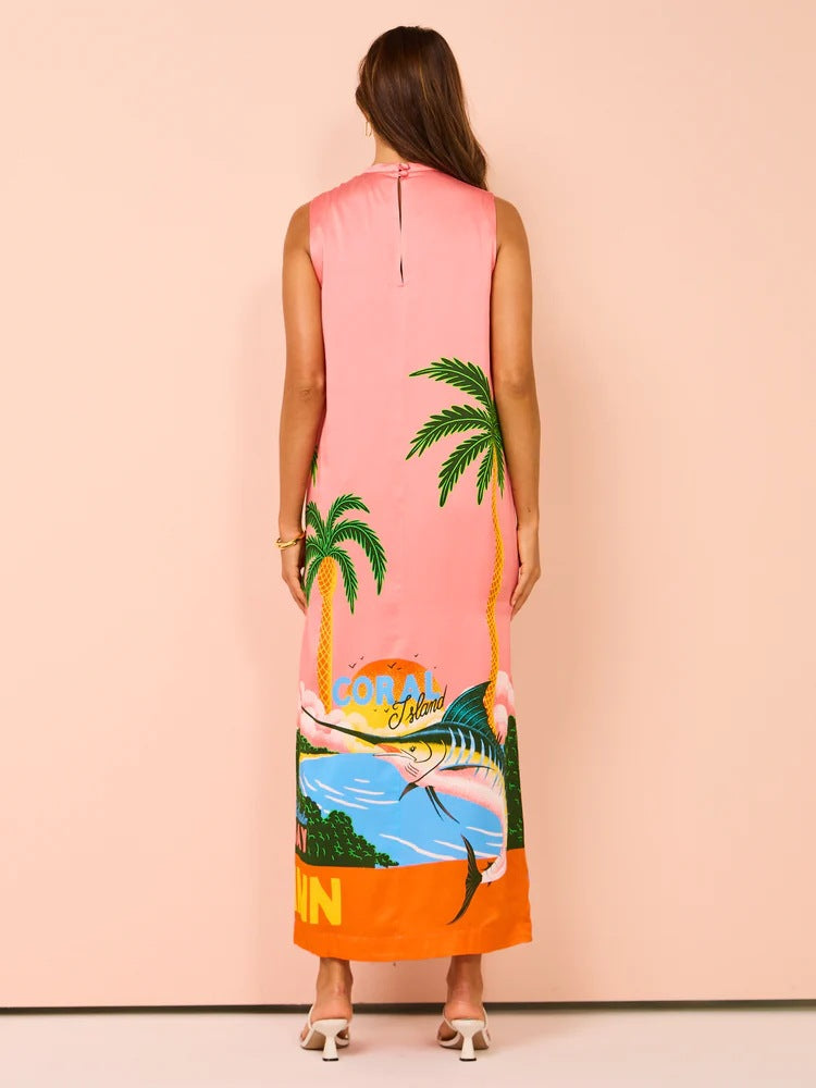 Роклята разполага със зашеметяващ принт и сатенена текстура, които придават луксозност и елегантност на тоалета. Безръкавият дизайн и цепката на роклята добавят съвременен и сексапилен акцент, който я прави подходяща както за ежедневието, така и за по-специални събития.