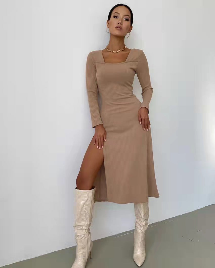 Дизайнът на роклята включва квадратна яка, която добавя модерен и изтънчен акцент, акцентираща на деколтето и придаваща уникален стил на облеклото. Дългите ръкави са елегантно завършени, добавяйки изтънченост и допълнителна топлина, идеални за по-хладните дни.