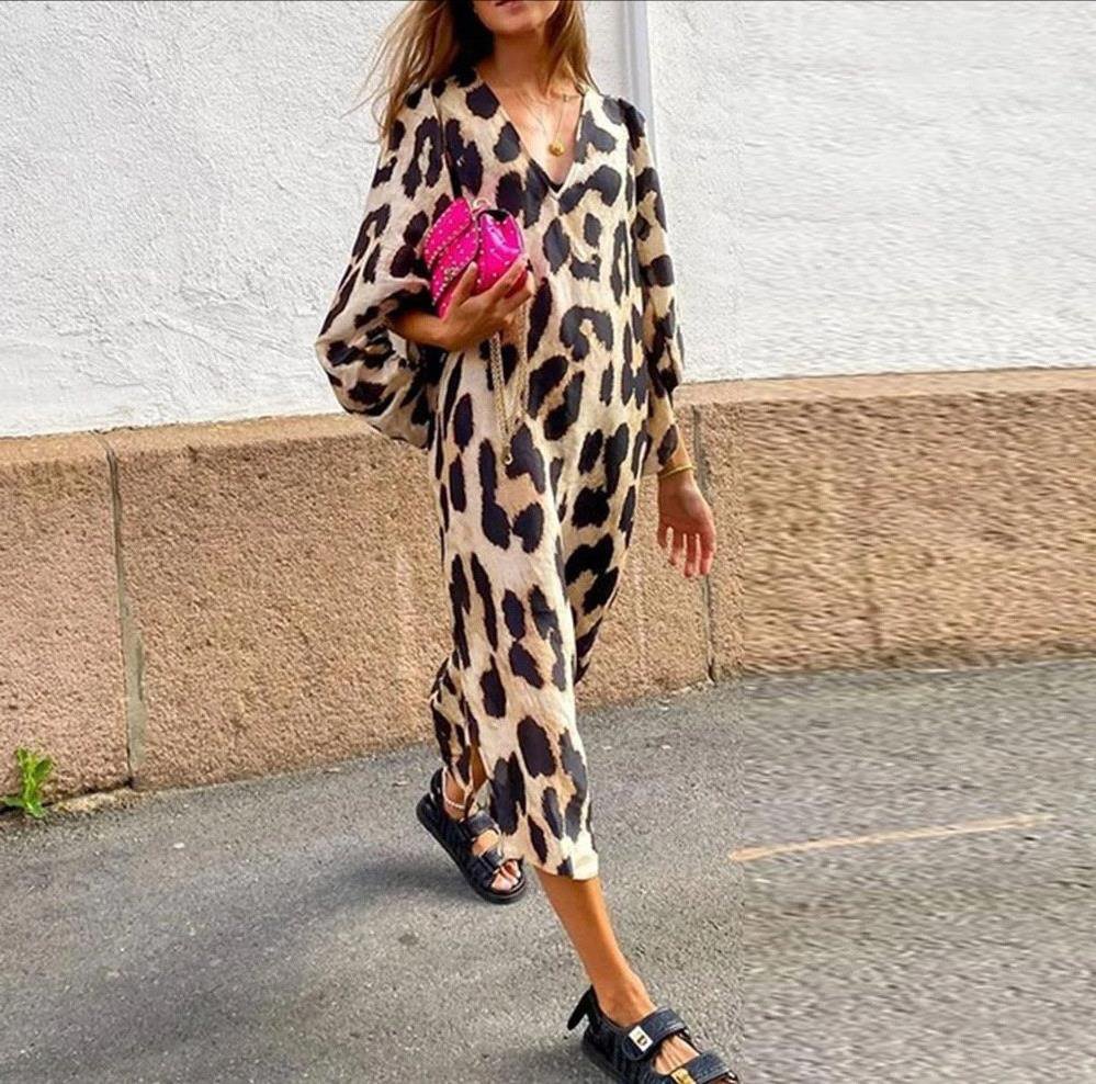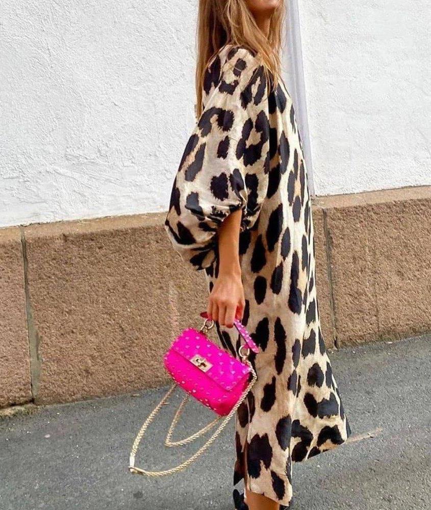 Със своя уникален леопардов принт, роклята добавя смел и дръзък акцент на вашето облекло. Свободният силует предлага лекота и свобода на движение, докато стилният дизайн подчертава женствеността.