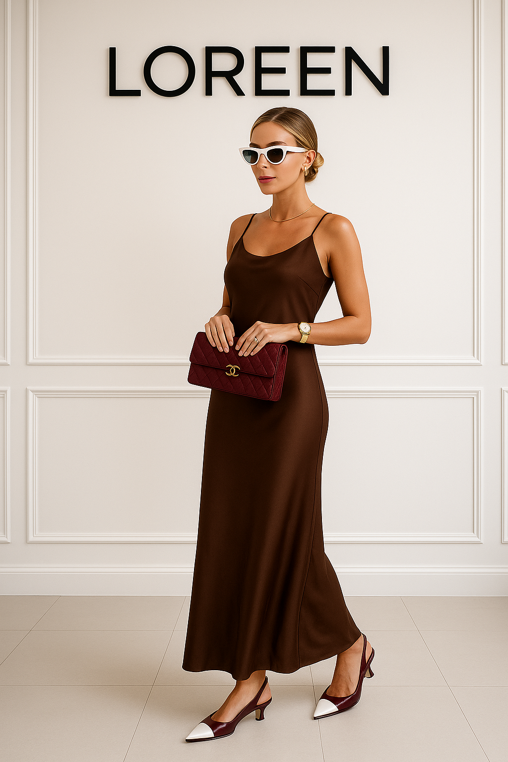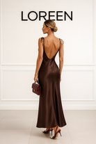 Елегантна дамска дълга рокля с тънки презрамки и изящно изрязан гол гръб. Изработена от лека и ефирна материя, която пада красиво по тялото, подчертавайки силуета.