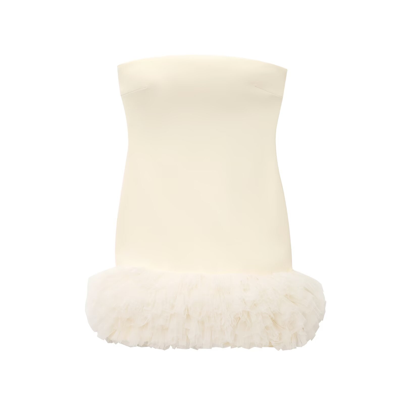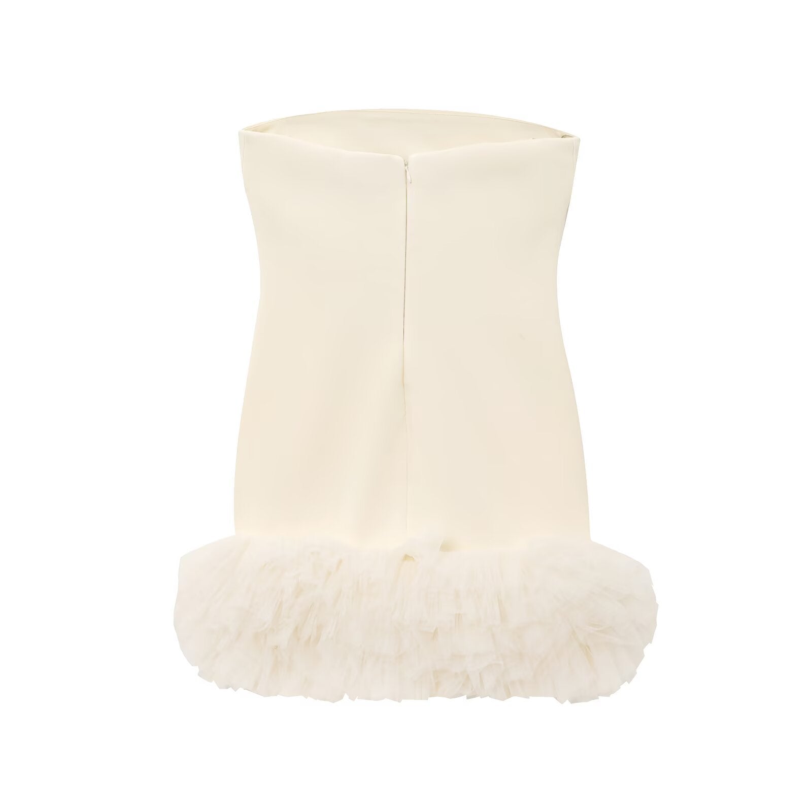 Изискана дамска мини рокля с бюстие дизайн и втален силует, която подчертава фигурата с елегантна лекота. Долният край е завършен с ефирен тюлен акцент, придаващ couture излъчване и романтично движение. Изчистената линия и нежният нюанс правят модела перфектен избор за специални поводи, коктейли и вечерни събития.