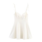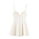 Елегантна дамска рокля с корсетен силует, създадена да подчертае талията и бюста с финес и женственост. Моделът е с оформени чашки и тънки връзващи се презрамки, които добавят деликатен акцент. Разкроената мини пола придава лекота и красиво движение, а изчистеният цвят айвъри прави роклята идеален избор както за специални поводи, така и за стилни летни визии.