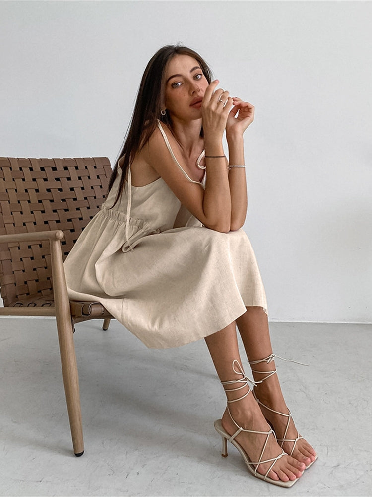 Изработена от висококачествени материали от памук и лен, която ще ви осигури свежест и удобство през целия ден. Силуетът тип "A-линия" придава изящество и женственост, докато презрамките и откритият гръб добавят нотка на модерност и сексапил.