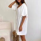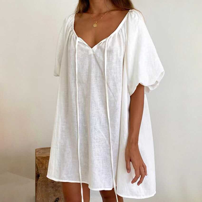 Тази свободна рокля с връзки съчетава комфорт и елегантност, идеална за горещите летни дни. Изработена от леки и дишащи материи, тя осигурява прохлада и удобство през цялелия ден.