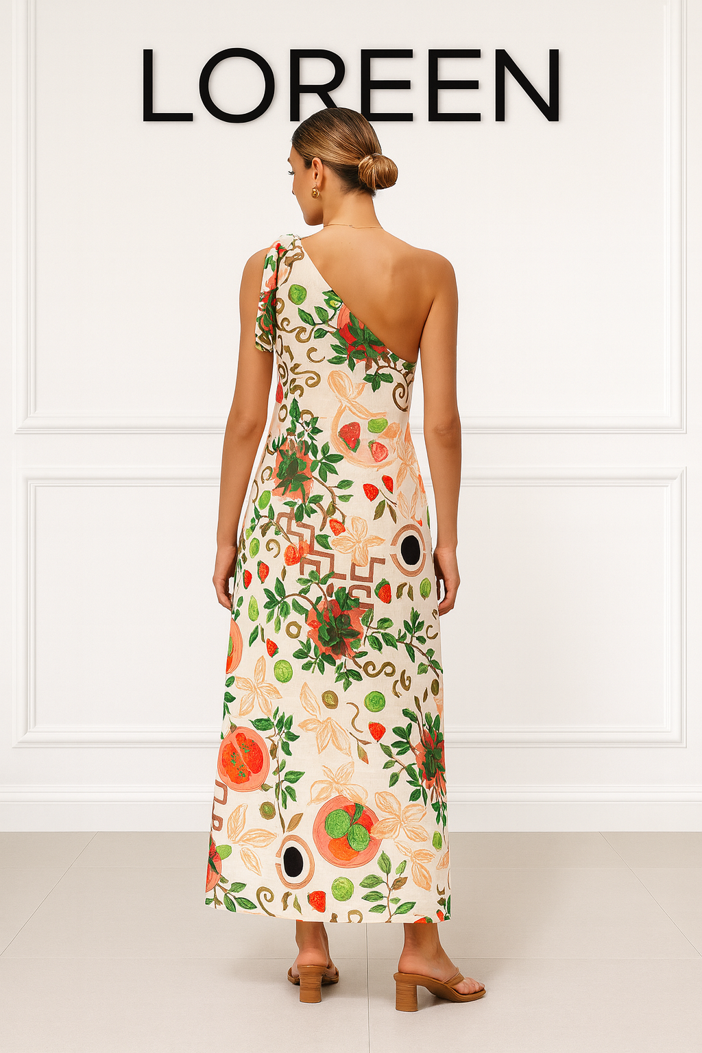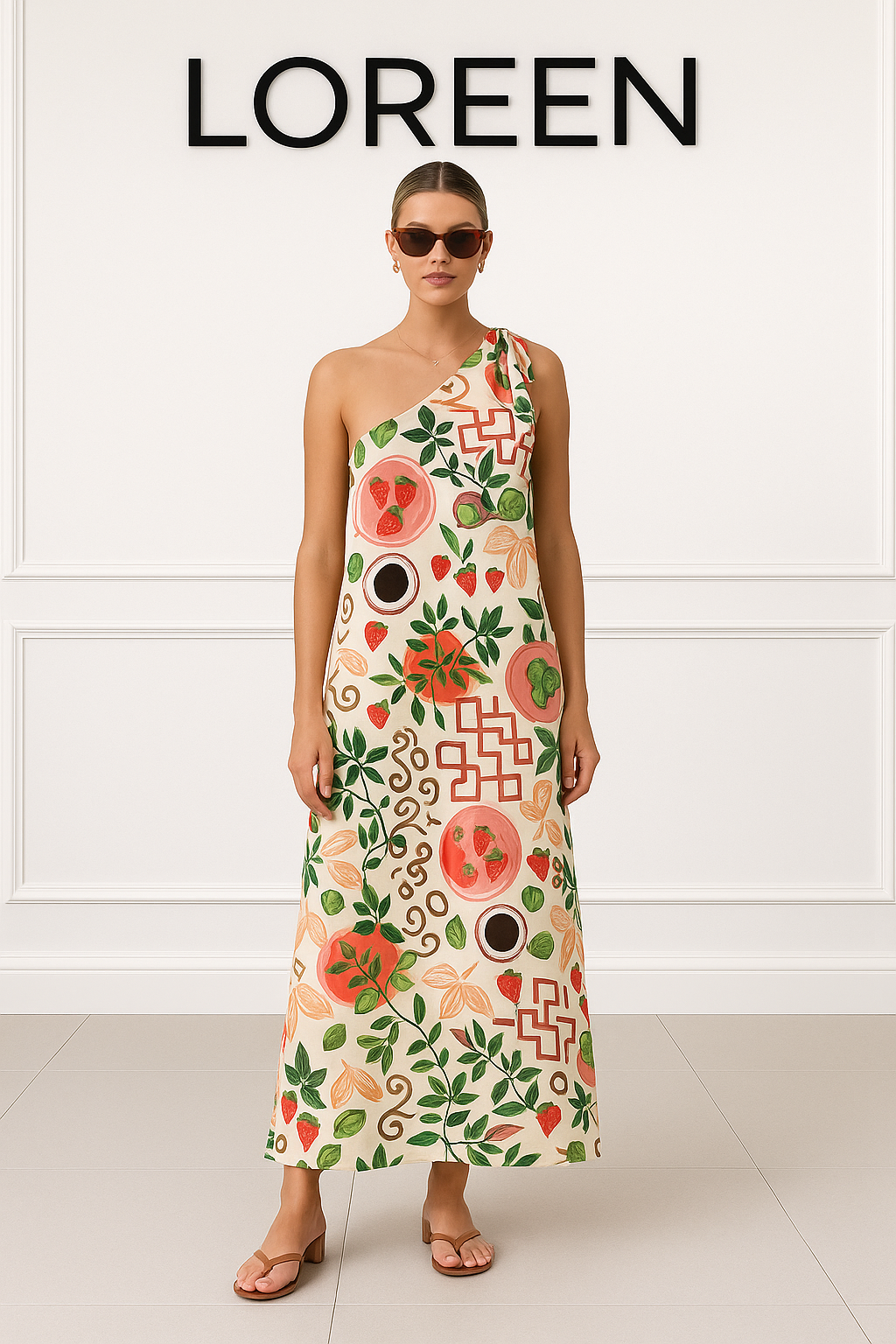 Ефирна дамска дълга рокля с едно рамо и свежи плодови мотиви. Леката материя осигурява комфорт и елегантно движение, а цветният дизайн придава свежест и лятно настроение.