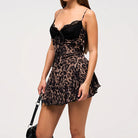Женствена дамска рокля с тънки презрамки, леопардов принт и дантела пачуърк. Моделът съчетава смелия животински мотив с нежната дантела за уникален и елегантен вид. Леката материя осигурява комфорт, а комбинацията от текстури добавя изисканост.